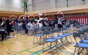 下の写真は上級生がアーチをもって、新一年生が入場するところです。
